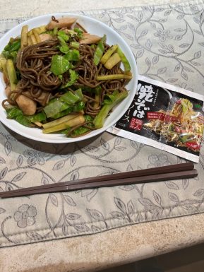 (我が家の夕飯の一コマです。日本そばで焼きそばは?と思うかもしれませんが・・・これがまた絶品です^^ 一度チャレンジして見てくださいませ。おすすめは一晩過ぎて、残ってしまったそばをアレンジして食べるとおいしいです。程よく麺からの水分が抜けるので・・・)